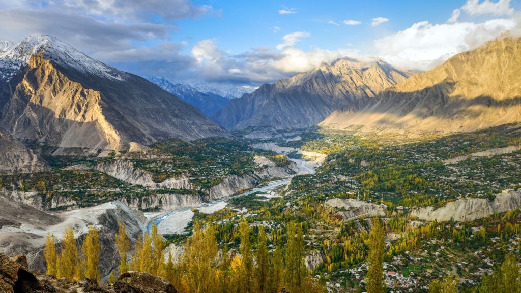 Hunza, often called the “Shangri-La of the Karakoram,” sits at 2,500 meters and is world-famous for its awe-inspiring beauty and the longevity of its people. Enclosed by towering peaks such as Rakaposhi and Ultar Sar, the valley offers panoramic views from the iconic Baltit and Altit forts. Its terraced fields produce cherries, apricots, and mulberries that thrive in the crisp mountain air. Karimabad, the cultural hub, charms visitors with traditional stone houses, wooden balconies, and vibrant handicrafts. Popular attractions include the Eagle’s Nest viewpoint, Passu Cones, and the turquoise waters of Attabad Lake. Hunza is also renowned for its warm hospitality and deep-rooted traditions.